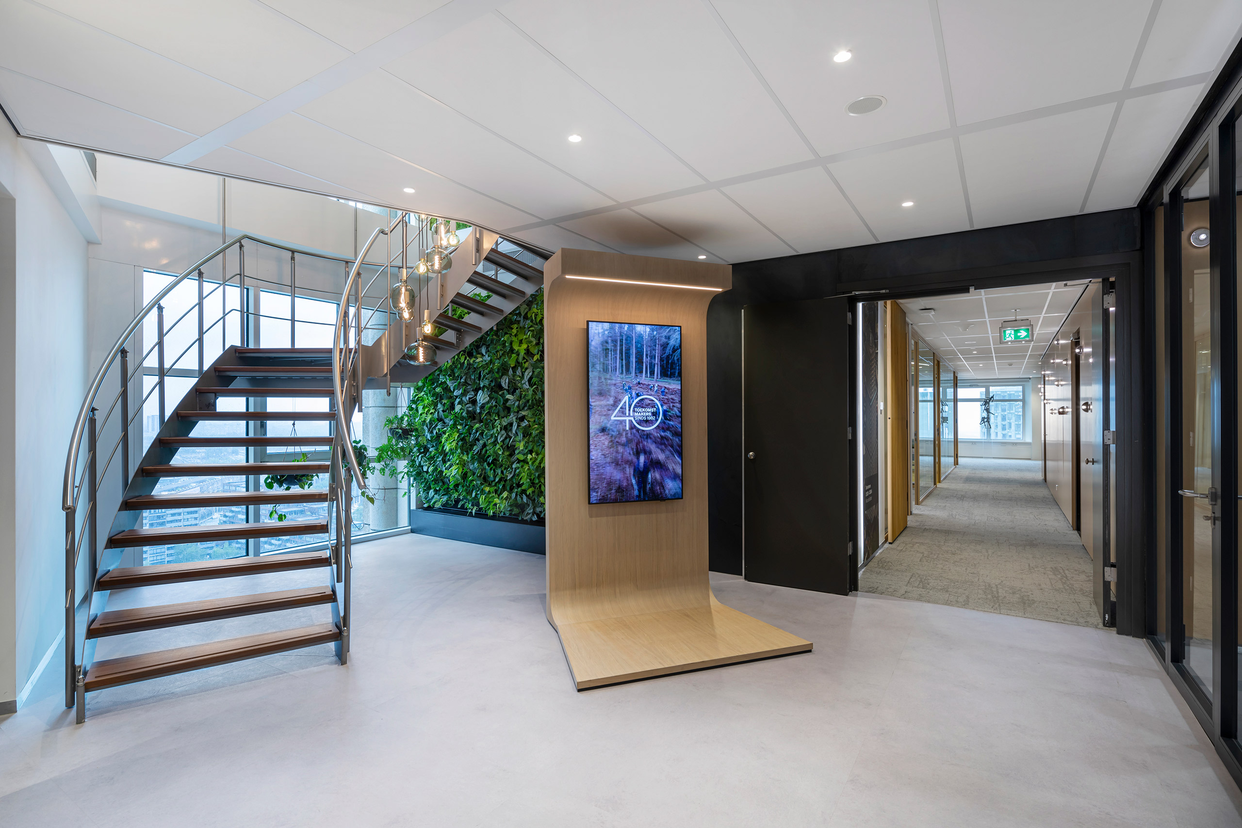 TBI staat voor duurzaam en met respect omgaan met wat er al is. De bestaande (hoogwaardige) materialen zijn daarom het uitgangspunt voor het ontwerp, de bekleding van de kern en de inleg in de vloer van het restaurant zijn daar voorbeelden van. Het natuurlijke van het hout combineren we met stoere materialen uit de bouwwereld, zoals staal en beton. Door veel planten toe te passen en dit door te trekken in de kleur groen, wordt het een warm en prettig geheel, waar alle gasten en medewerkers van TBI zich thuis voelen.